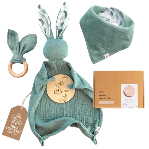 | Included Components | Muslin lovey blanket, muslin cotton bib, wooden teether, wooden baby announcement sign |